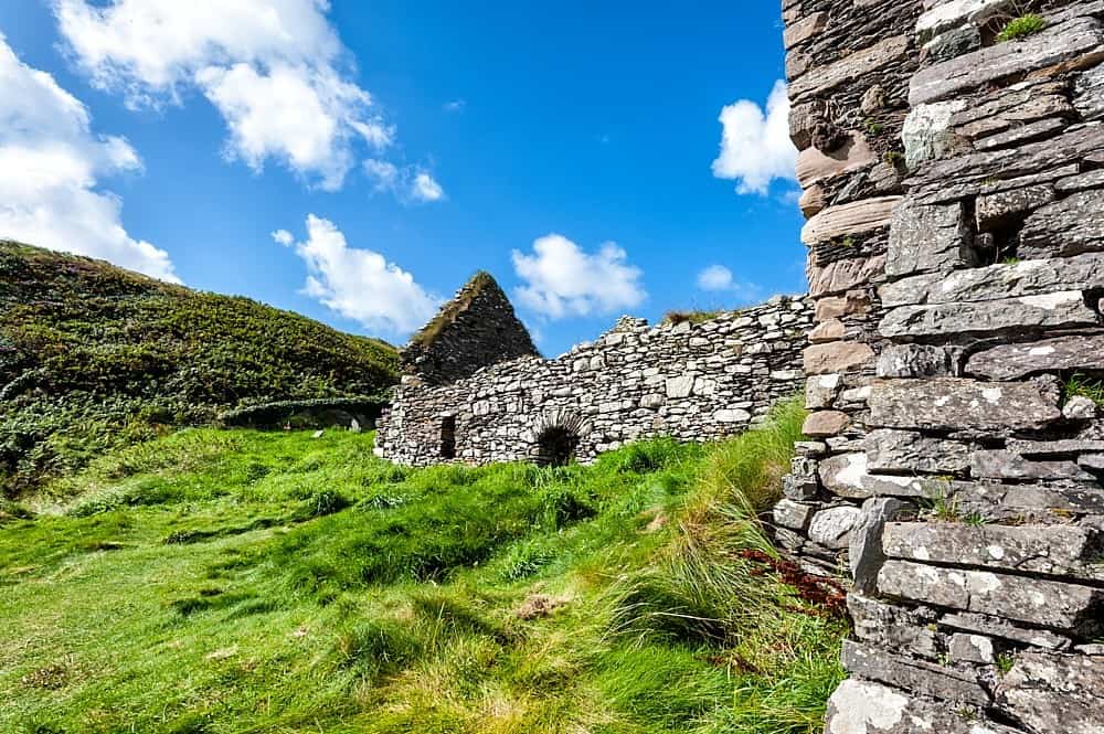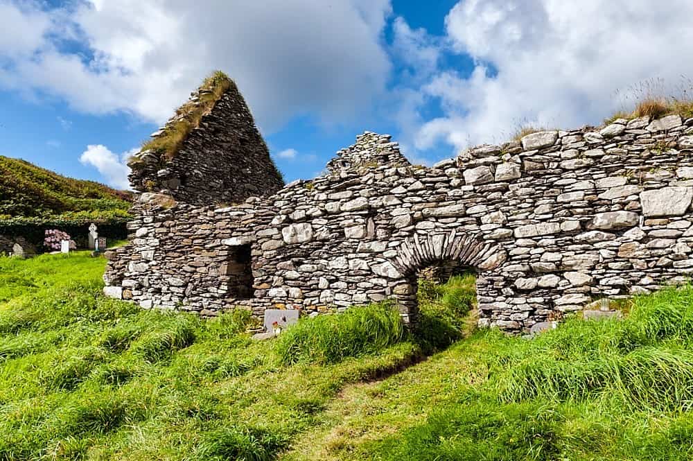 The ruin of Derrynane Abbey sits enthroned over one of Ireland’s most beautiful beaches. In common parlance, the idyllic patch of land on which the ruins stand, is called โAbbey Islandโ. This name is misleading as there is no real island. Because of the constant silting up the ยดisland` is connected directly with the sandy beach of Derrynane, so you can reach Abbey Island dry-shod.