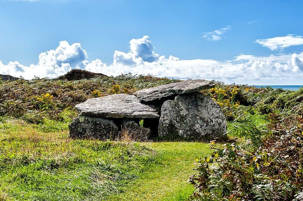 The altar wedge grave is located at Toormore Bay in the immediate vicinity of the Wild Atlantic Way. The megalithic tomb was built here at the end of the Stone Age (ca. 3000 to 2000 BC). The finding of bones suggest that the tomb was a sacred place for many centuries. Although the ancient rites disappeared with the arrival of Christianity, the complex was again used for rituals in the 18th century. This time it was priests who used the capstone of the tomb as an altar, at a time they were forbidden to hold mass in churches.