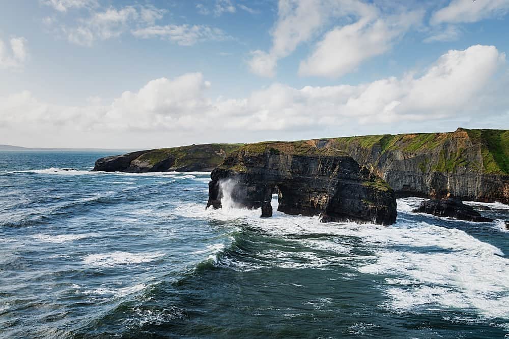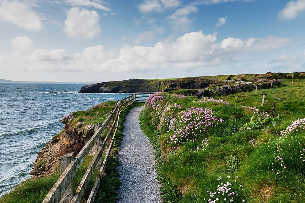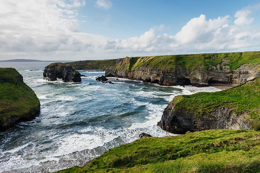 On the edge of the popular seaside resort of Ballybunion lies Ballybunion Castle, overlooking two large sandy beaches. At the northern end of Ladies Beach (also called North Beach) is theย starting point of the so-called “Cliff Walk”. It leads along the coast to Nun’s Beach, an inaccessible beach with rugged cliffs.