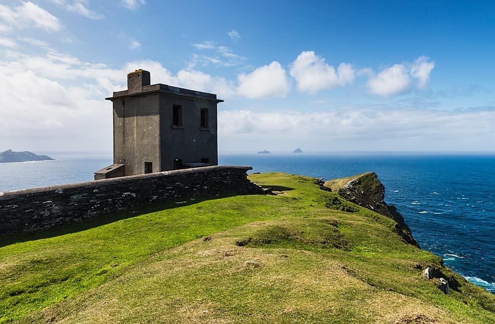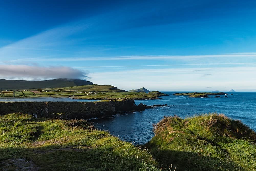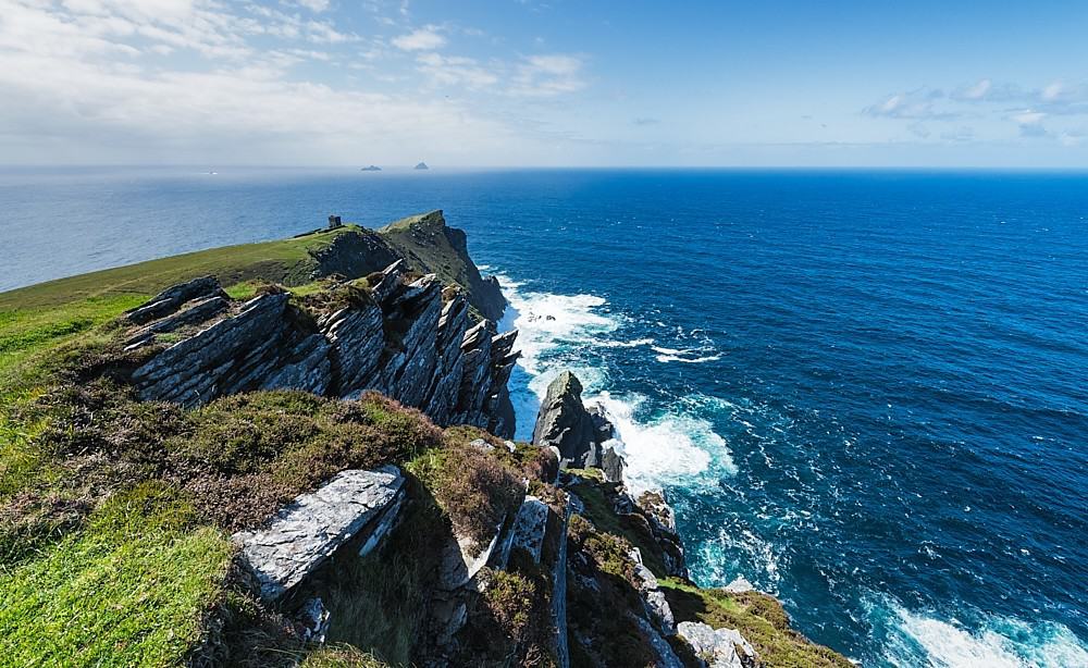 Bray Head – located on Valentia Island, can be reached in a 25-minute walk from the car park at Foilhommerum Bay. At the top are the remains of an observation tower built in 1815. Instead of returning the same way, it is recommended to follow the “Bray Head Loop”. This path leads along meadows back over the ridge to the parking area and offers a wonderful panoramic view of Bray Head, Dingle Bay, Valentia Island and the Portmagee Channel.