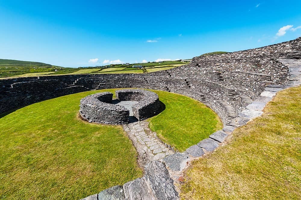 The Cahergal Stone Fort is an impressive example of an Iron Age ring fort. A few of such forts can be found in Ireland. The restored fort has a massive outer wall measuring 4 metres at the highest point. Inside the ring fort are the remains of a circular building.