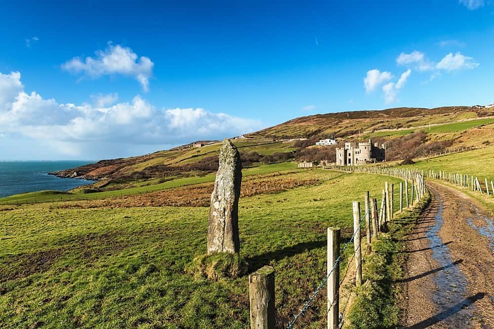 The ruins of Clifden Castle are surrounded by lush green hills above Clifden Bay. Through the entrance gate at the Upper Sky Road, you can reach the ruin in a 10 minutes stroll along a meadow-lined path. The path leads past ancient standing stones and through a peaceful landscape. Since the inside of the castle is closed and cannot be visited, the walk to the castle and back is the real highlight of a visit.