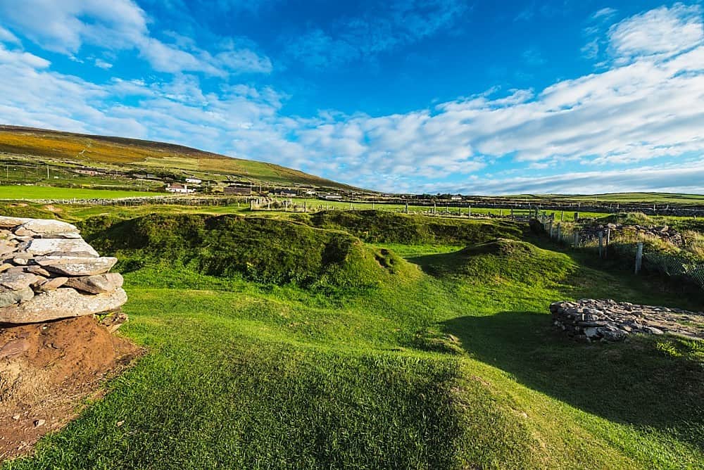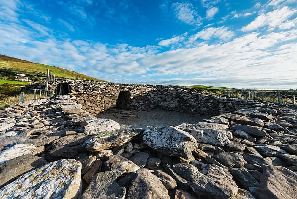 The Iron Age fortification Dunbeg Fort is located directly on the edge of a cliff. Towards the land, several earth walls and a massive rampart served as protection against attackers. Inside the complex there is the foundation of a building. The strategically protective location on the edge of the cliffs has become increasingly disastrous in recent years, when parts of the site slipped into the sea. Dunbeg Fort is part of the Fahan Group – a series of ancient dwellings on the Dingle Peninsula.