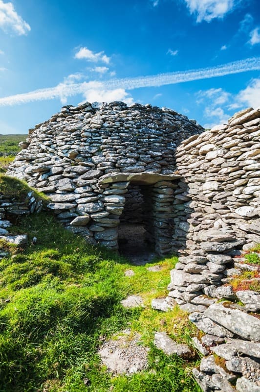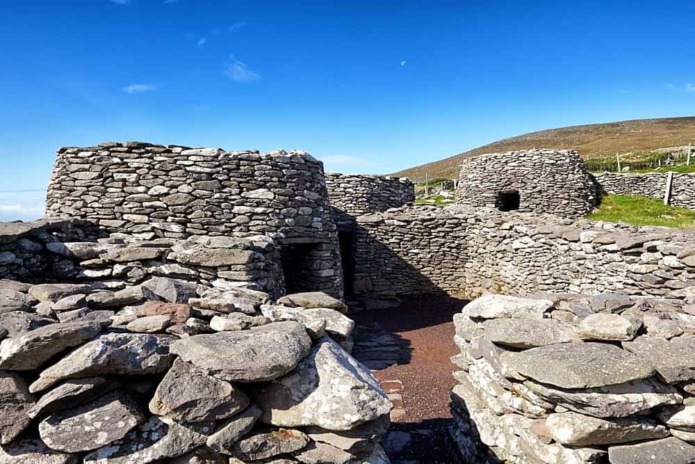 The Fahan Group is a collection of prehistoric buildings on the Dingle peninsula, consisting of Clochรกns (Beehive Huts), caves and forts. Especially the large number of well-preserved beehive huts in this area is unique. The exact age of the buildings near Fahan is uncertain, since such Clochรกns were built from the Iron Age to modern times.