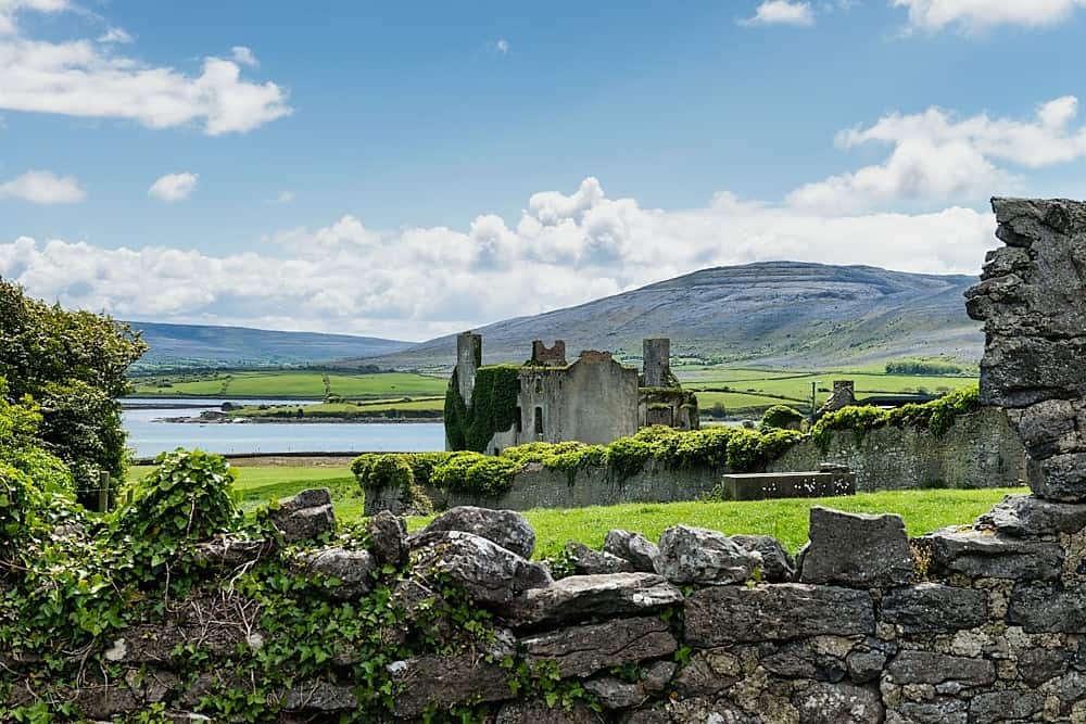Finavarra House was built in 1825 in a beautiful location overlooking the bay and mountains of the Burren area. The ruin of the former manor house stands on the grounds of an agricultural estate. Huge holes in the bordering wall reveal views of the ruin at several points.