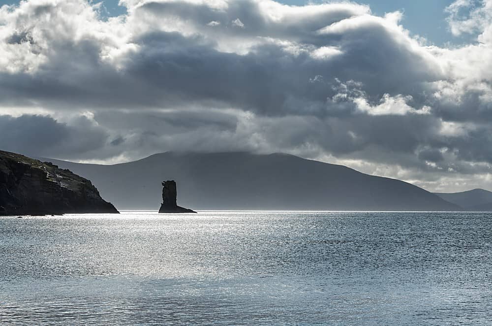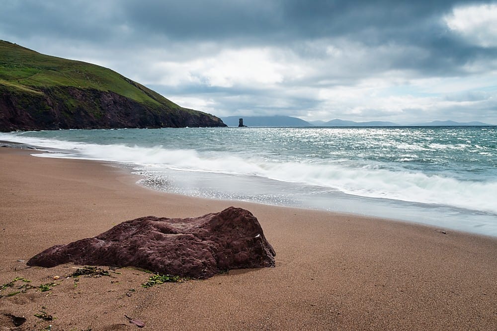 Trรก Chathail near Kinard is one of the most beautiful beaches of the Dingle Peninsula. The beach is lined by rocks. Offshore the huge sea stack An Starrach (also called The Foal) dominates the scenery.