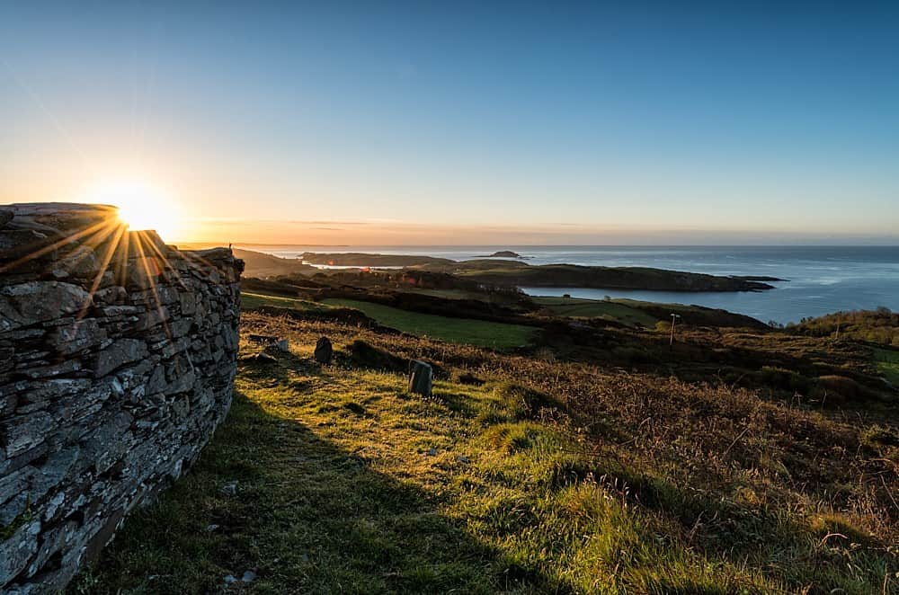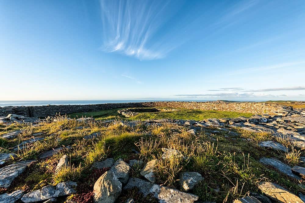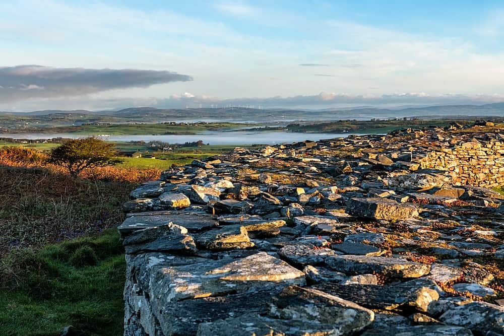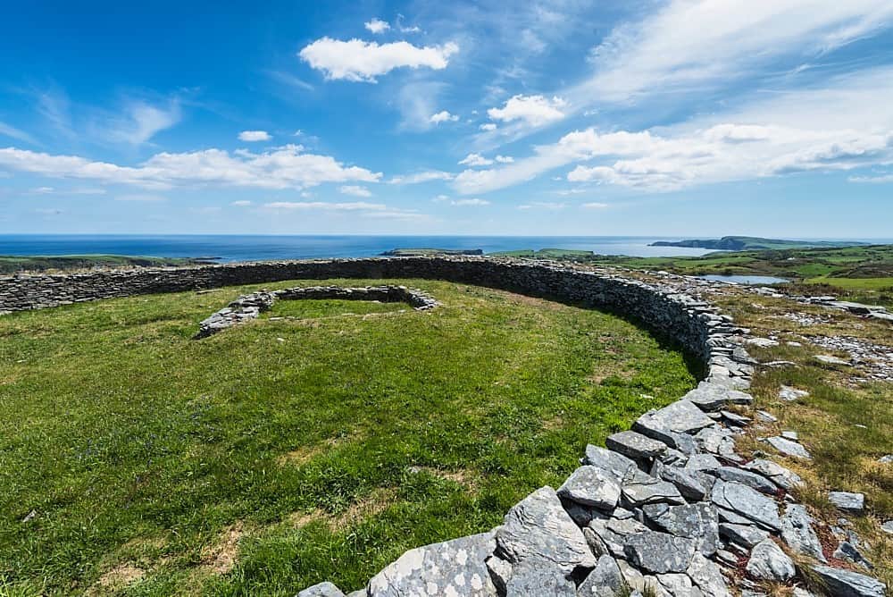Knockdrum stone fort is situated on a hill in the middle of a peaceful landscape. The view from up here over the bay is unique. The outer walls of the restored ring fort are almost 2 metres high. In the centre are the foundation walls of a square building.