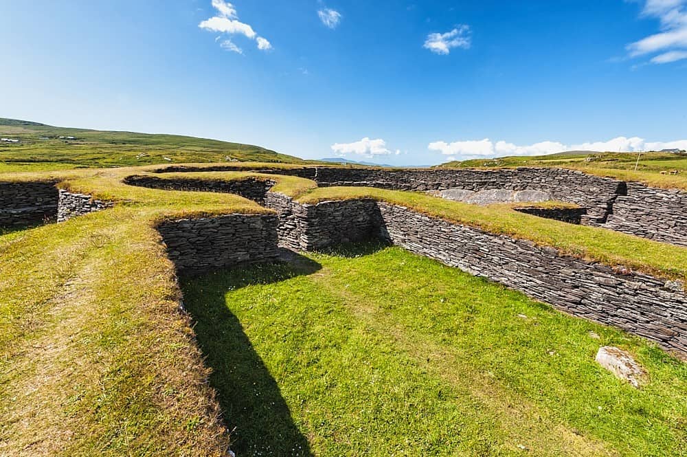 Leacanabuaile Stone Fort is located on the Ring of Kerry, about 4,5 km northwest of Cahersiveen. There is no car park at the fort, but you can easily walk there from the car park at Cahergal Stone Fort.