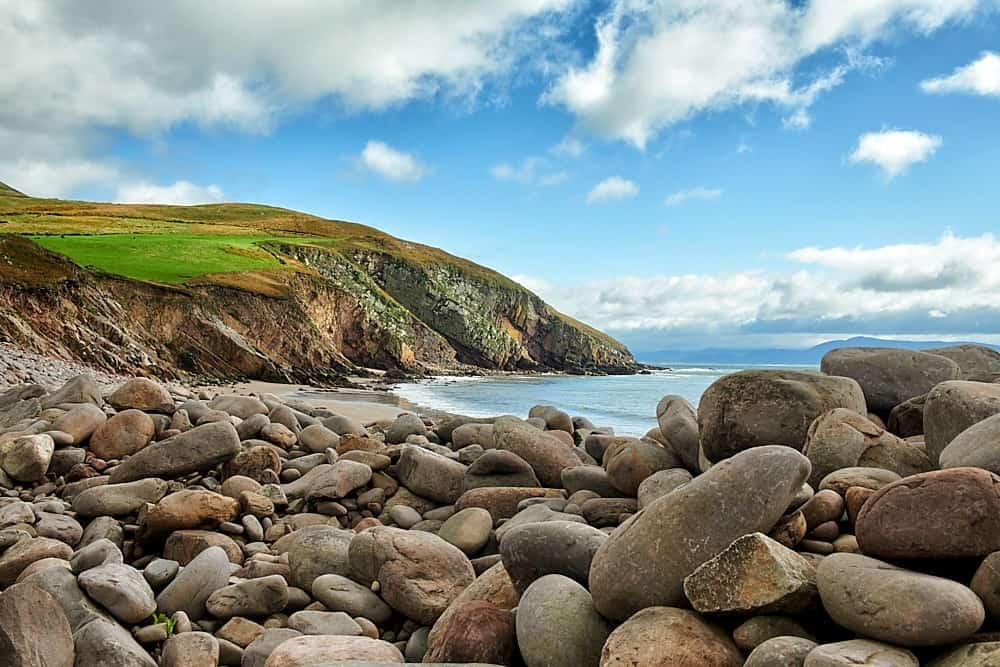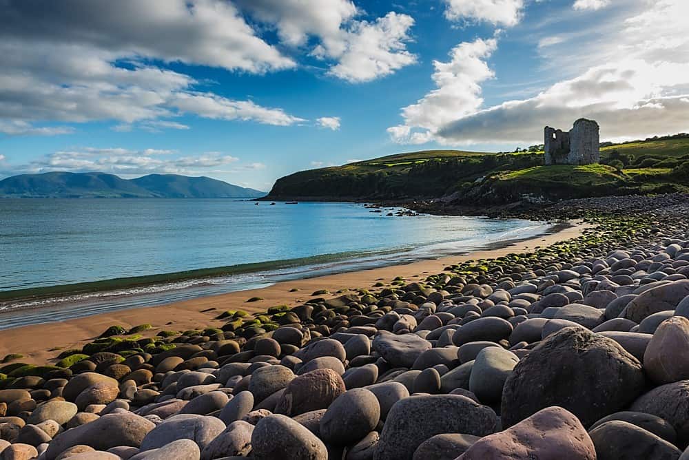 Minard Castle stands majestically on a hill high above Kilmurry Bay. The ruin is badly damaged – a result of the siege by Cromwell’s troops in 1650, which no inhabitant survived. Remarkable is the beach below Minard Castle – a storm bay with large pebbles, that were washed ashore by the sea.