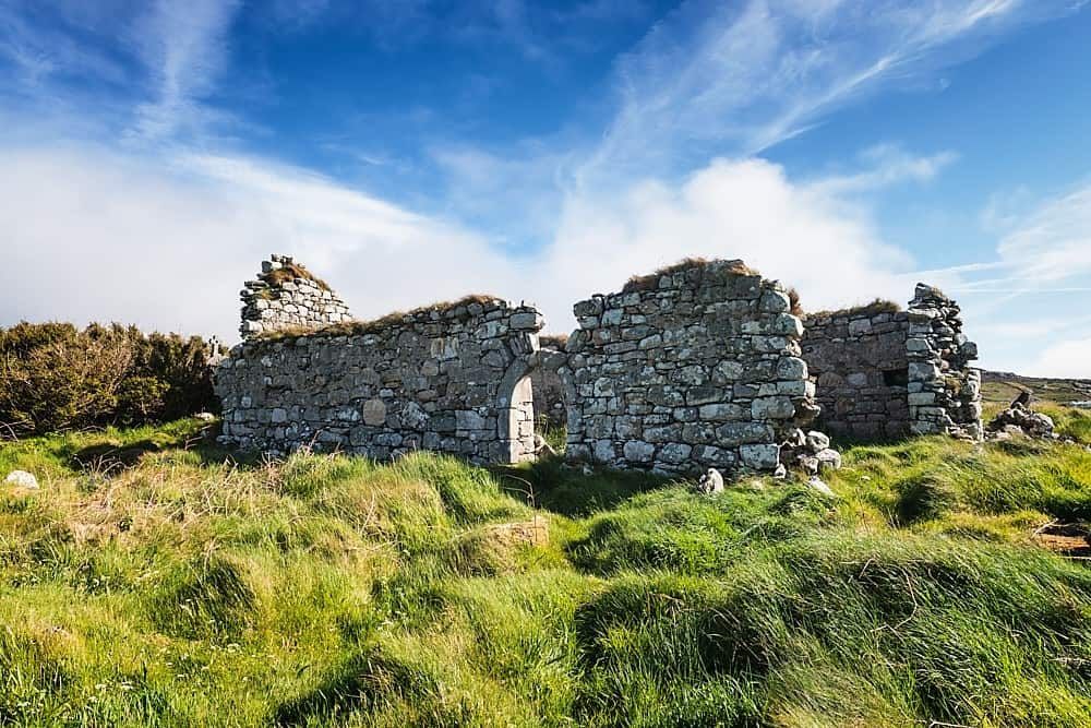 The Wild Atlantic Way leads to the discovery point โCrump Island Viewโ on the Rinvyle Peninsula (sometimes also spelled Renvyle). Not only the beach, but especially the western part of the peninsula are worth a visit. This has a number of attractions to offer, including an impressive coastal scenery at Rinvyle Point, a 14th century tower house, an ancient cemetery with church ruins and, above all, plenty of rural seclusion.