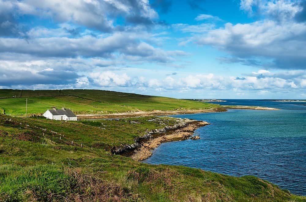 Sky Road is a panoramic road that starts and ends in Clifden, the capital of Connemara. From Clifden the road heads west and soon you reach a junction between Lower Sky Road and Upper Sky Road. The upper path gradually rises and at the highest point you reach a vantage car park. The view from up here over Clifden Bay and the offshore islands in the Atlantic Ocean is breathtaking.