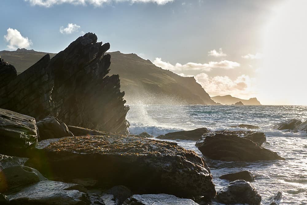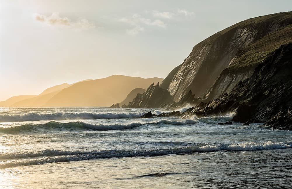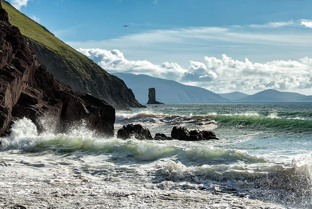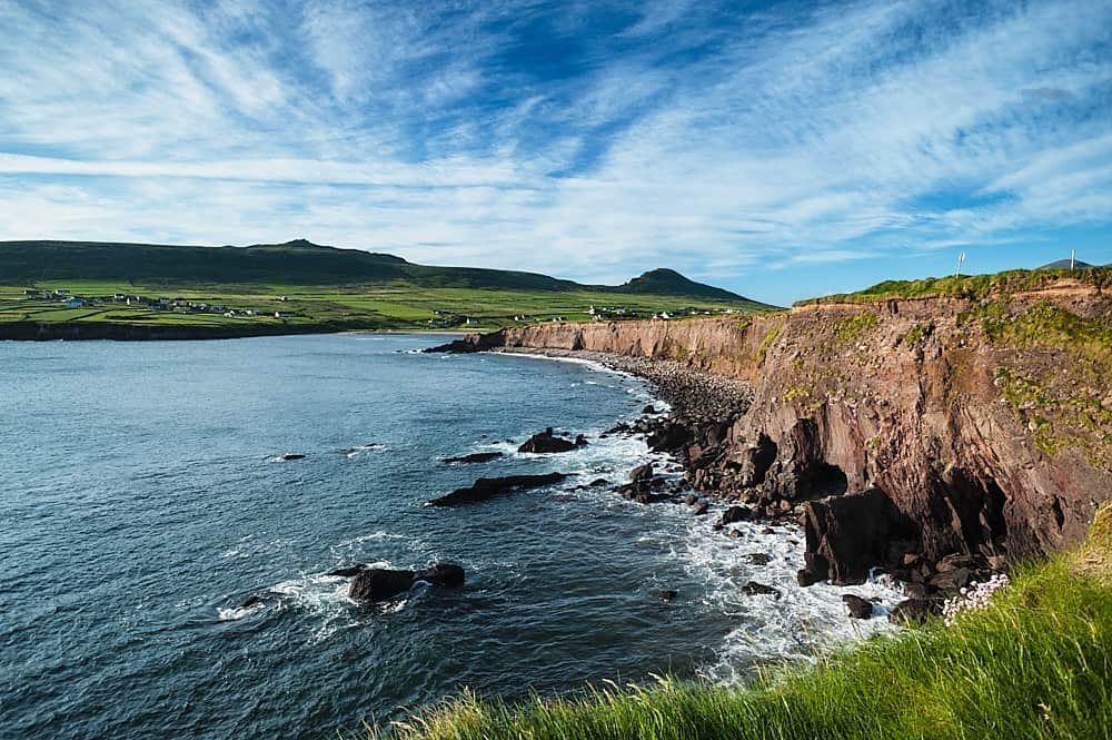 Once you have made it to Dingle Town, the next adventure awaits with the Slea Head Drive. The route leads right into the heart of the Irish-speaking Gaeltacht region and through possibly the most beautiful area in Ireland. The narrow road winds its way westwards along a steeply sloping coastline. Just off the coast are the Blasket Islands, the largest of which, An Blascaod Mór, can be reached from Dunquin. Once you have circumnavigated Slea Head, Mount Brandon, Ireland's second highest mountain, rises into the sky in the centre of the countryside in the immediate proximity of the Atlantic. A multitude of Celtic and early Christian monuments, such as Ogham stones, beehive huts and ecclesiastical buildings such as the Gallarus Oratory or the monastery site of Reask, prove that people have lived in this beautiful region since prehistoric times.